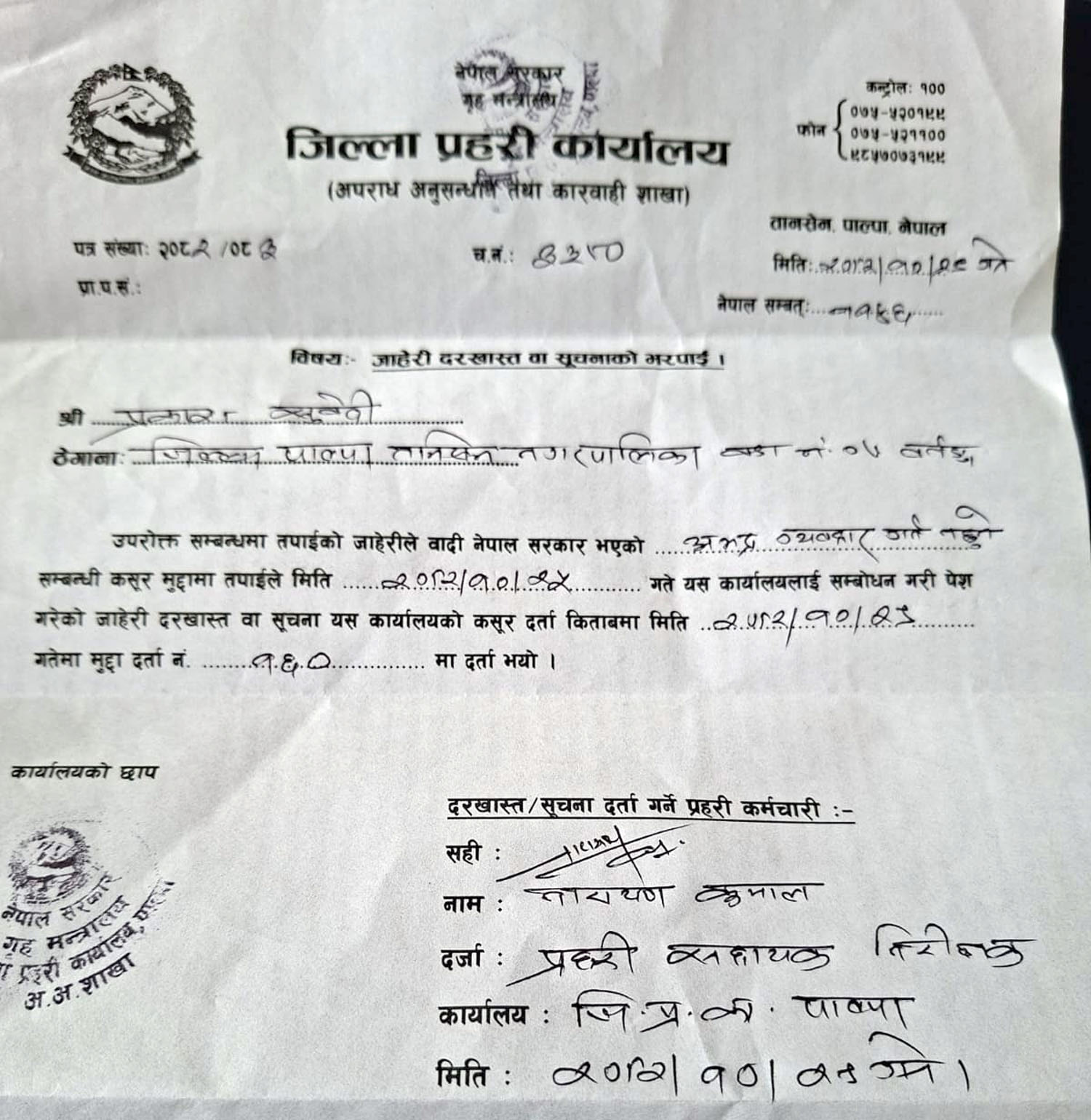 रेग्मीले हातपात गरे पछि हिमायन बैकको तर्फबाट हातपात र अभद्रव्यवहार गरेको भन्दै जिल्ला प्रहरी कार्यालय पाल्पा समक्ष बैंकका म्यानेजर प्रकाश सुवेदीले लिखित जाहेरी दिएका थिए । जाहेरी पछि, रेग्मीलाई प्रहरीले नगरानी राखेको थियो । चैत्र ६ गते शुक्रवार पाल्पा उद्योग वाणिज्य संघको निर्वाचनमा मनोनयनका लागि संघको कार्यालयमा आएको मौकामा महिला प्रहरीले नियन्त्रणमा लिएर सोध पुछ भई रहेको जिल्ला प्रहरी कार्यालय पाल्पाका प्रहरी नायव उपरीक्षक ओम प्रकाश चौधरीले शित्तलपाटीडटकम संग पुष्ट गरे । प्रहरीले नियन्त्रण लिए पछि, आरोपि मन्जु रेग्मीले भने,आफुले गल्ती नगरको जिकिर गरेकी छन् ।