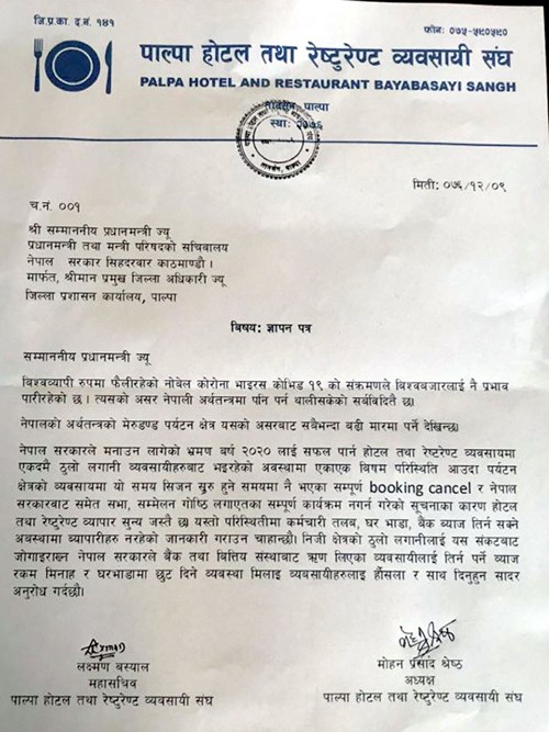 कोरोनाका कारण विश्वव्यापी रूपमा देखिएको आर्थिक मन्दीको असर स्थानीय व्यवसायमा देखिन थालेकाले व्याज मिनाहको माग गर्दै पाल्पा होटल तथा रेष्टुरेण्ट व्यवसायी संघले आईतबार प्रमुख जिल्ला अधिकारी मार्फत प्रधानमन्त्रीलाई ज्ञापन पत्र बुझाएको छ । संघका अध्यक्ष मोहनप्रसाद श्रेष्ठले प्रमुख जिल्ला अधिकारी यादव सुवेदी मार्फत प्रधानमन्त्री केपी शर्मा ओलीलाई ज्ञापन पत्र बुझाएका हुन् । ज्ञापनपत्र बुझाउँदै संघका अध्यक्ष श्रेष्ठले होटल व्यवसायी तथा निजी क्षेत्रलाई राहत दिन माग गरेका छन् । होटल व्यवसायी आर्थिक मन्दीको मारमा पर्न थालेको र बैंकको ब्याज बुझाउने अवस्था समेत नरहेको महशुस गरी संघले राहतका कार्यक्रम अघि सार्न सरकारसँग माग गरेको छ ।
